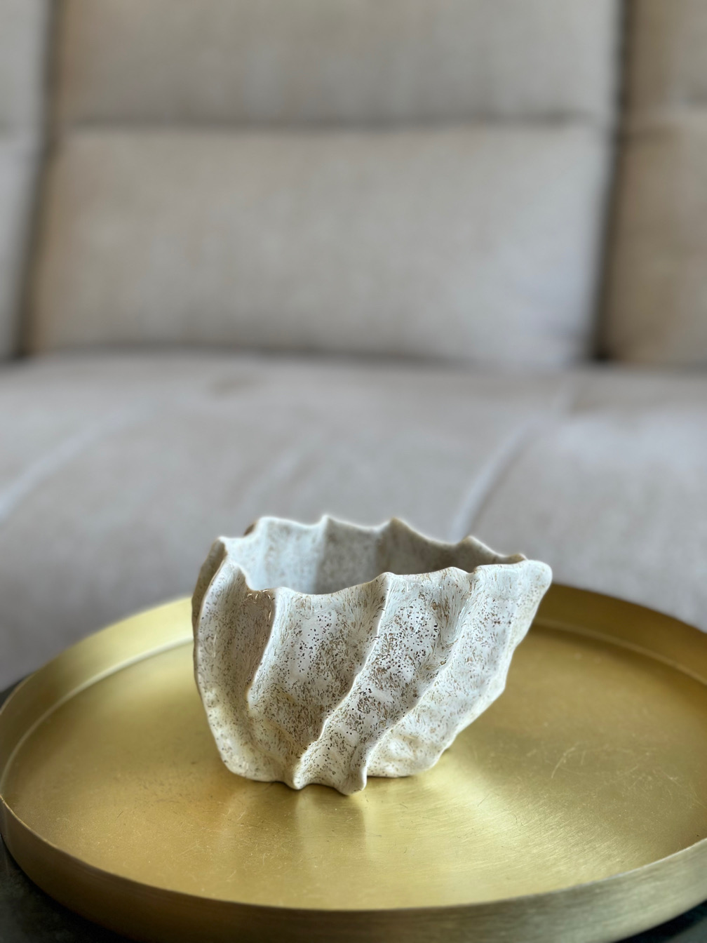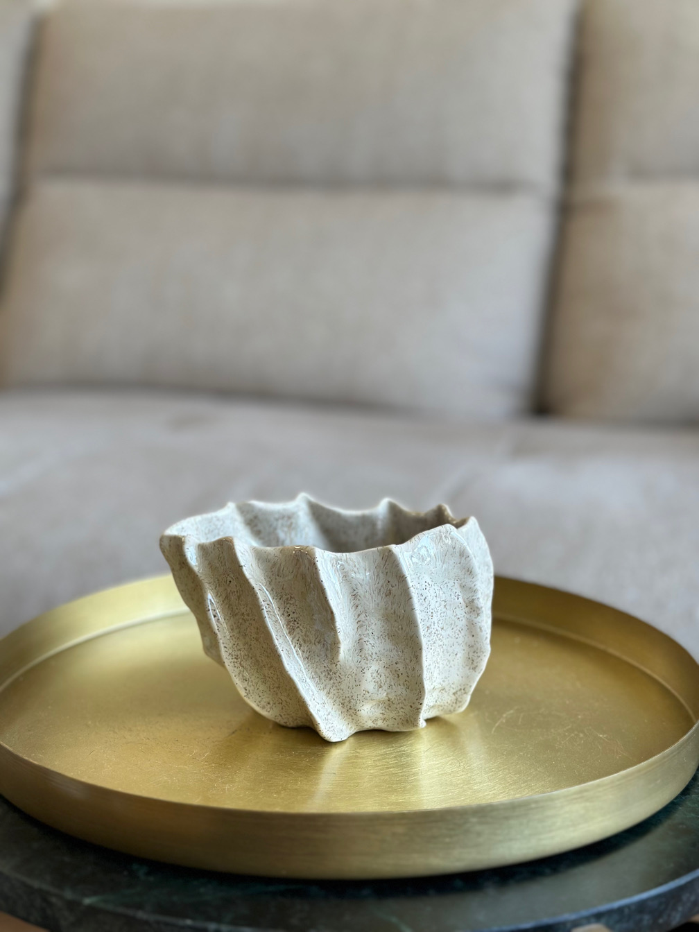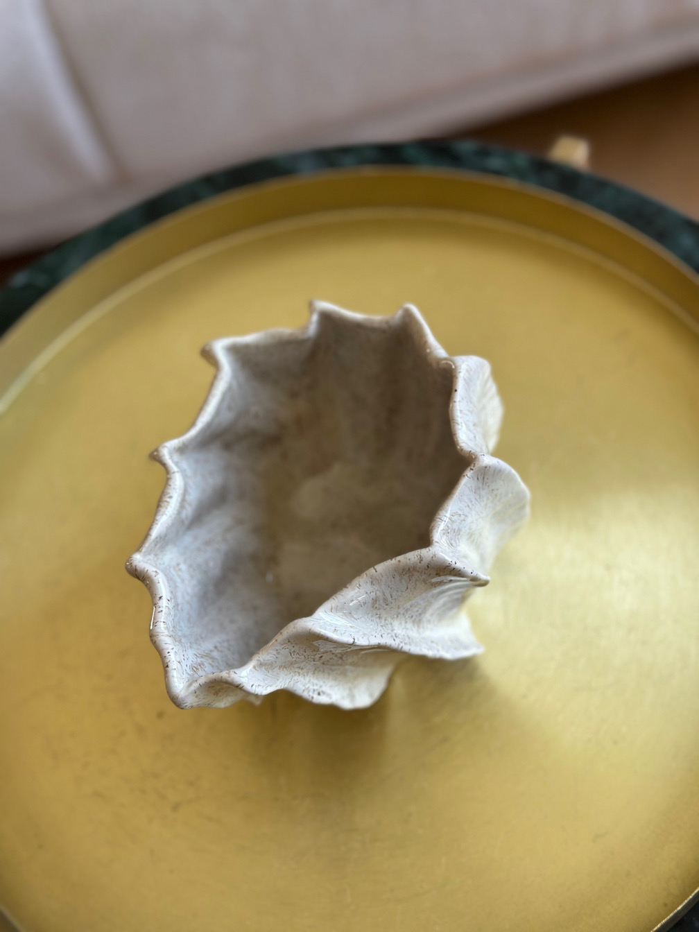 Naczynie ulepiłam ręcznie, a faktura, którą nadałam jej od zewnętrznej strony delikatnie nawiązuje do muszli. Jej organiczny kształt idealnie koreluje z oryginalnym szkliwem w odcieniach beżu, z delikatnymi przebarwieniami w brązie.
