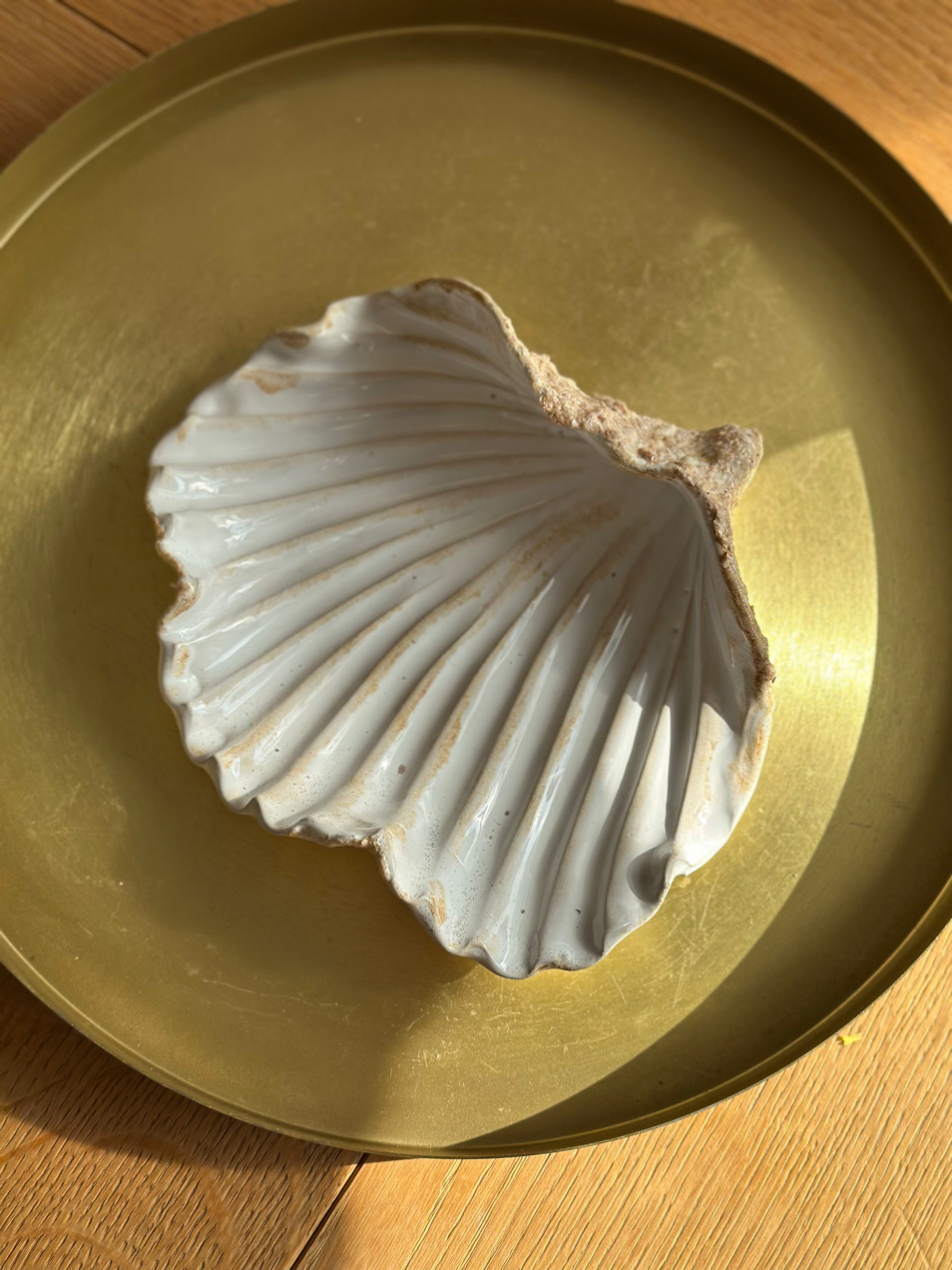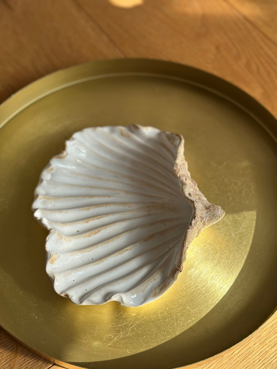 Muszla poszkliwona została białym błyszczącym szkliwem z delikatnymi beżowymi maźnięciami i szkliwem, które wyglada niczym piasek przyklejony do muszli!