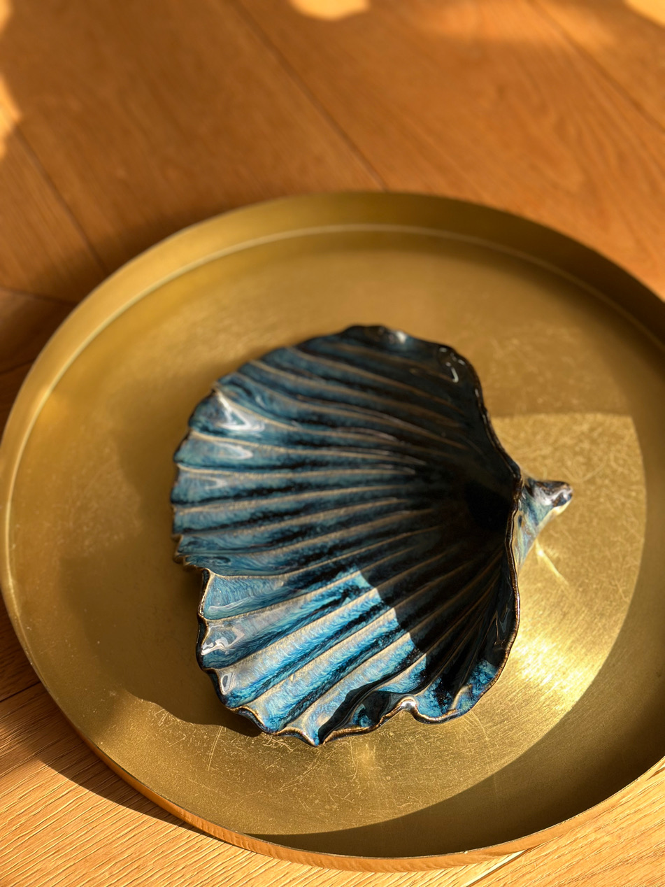 Górna część muszli pokryta jest szkliwem w przeróżnych odcieniach niebieskiego przywodząc na myśl błękit oceanu, z kolei od spodu poszkliwiłam ją czernią wpadającą w granat.