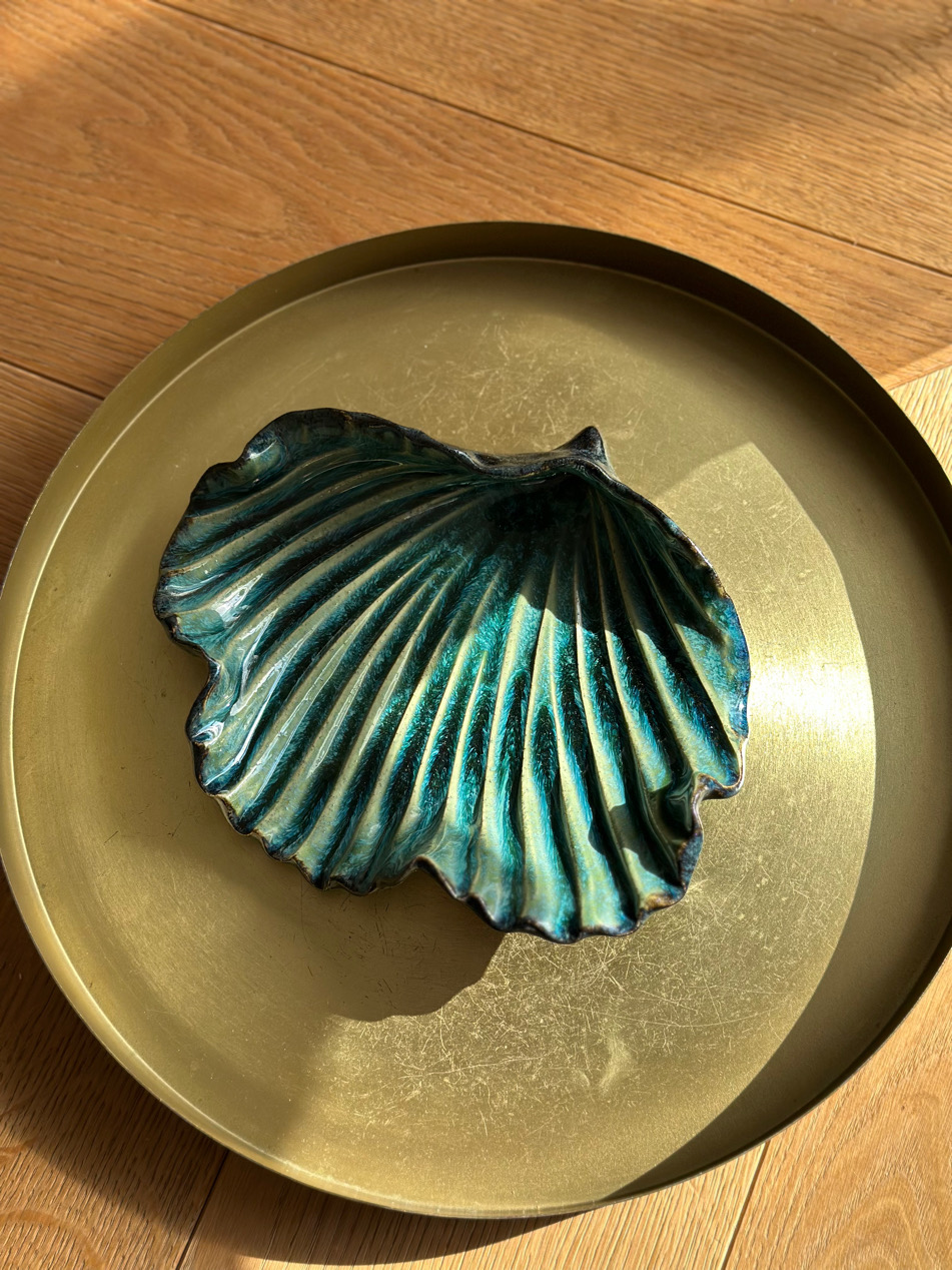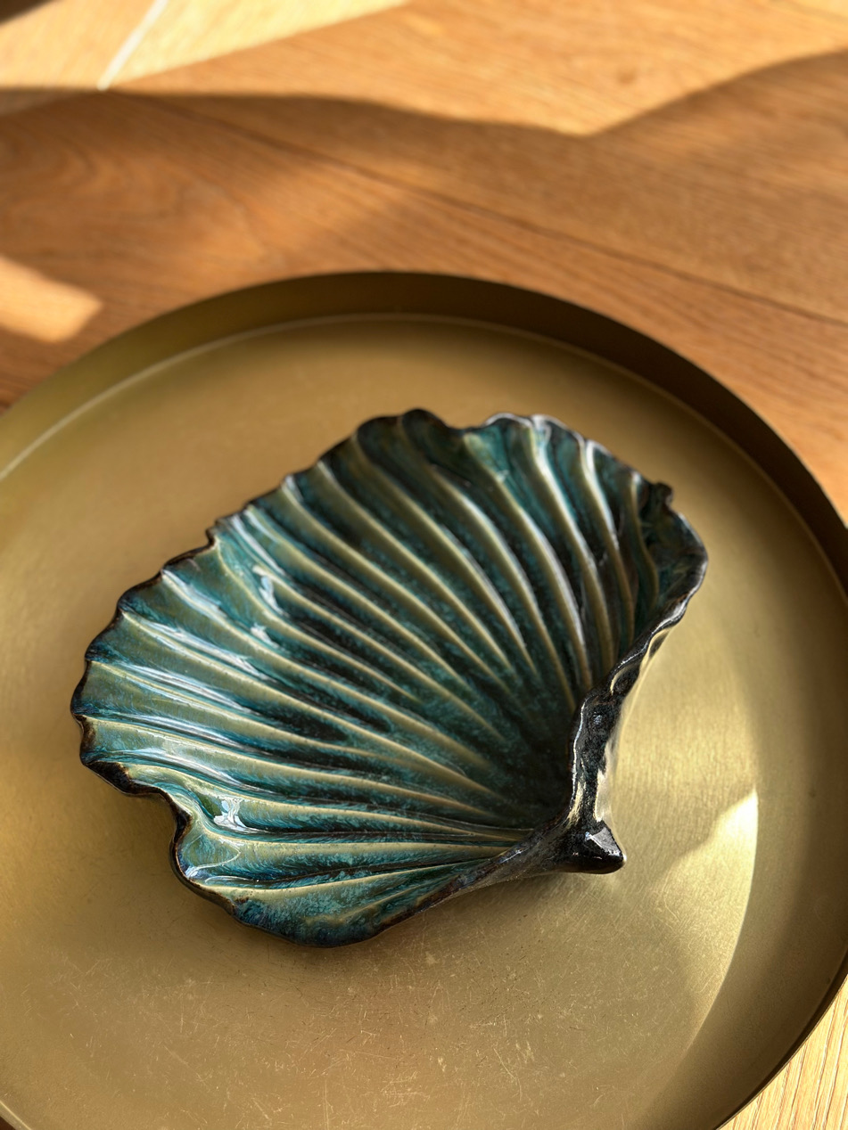 Muszlę poszkliwiłam od góry przecieranym zielono-turkusowym szkliwem, od spodu czarno-grafitowym szkliwem w półpołysku i nieregularnej strukturze, co pięknie podkreśla organiczny charakter ceramiki.