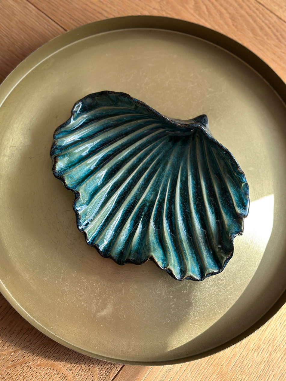 Muszlę poszkliwiłam od góry przecieranym zielono-turkusowym szkliwem, od spodu czarno-grafitowym szkliwem w półpołysku i nieregularnej strukturze, co pięknie podkreśla organiczny charakter ceramiki.