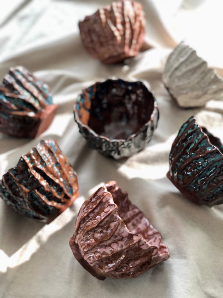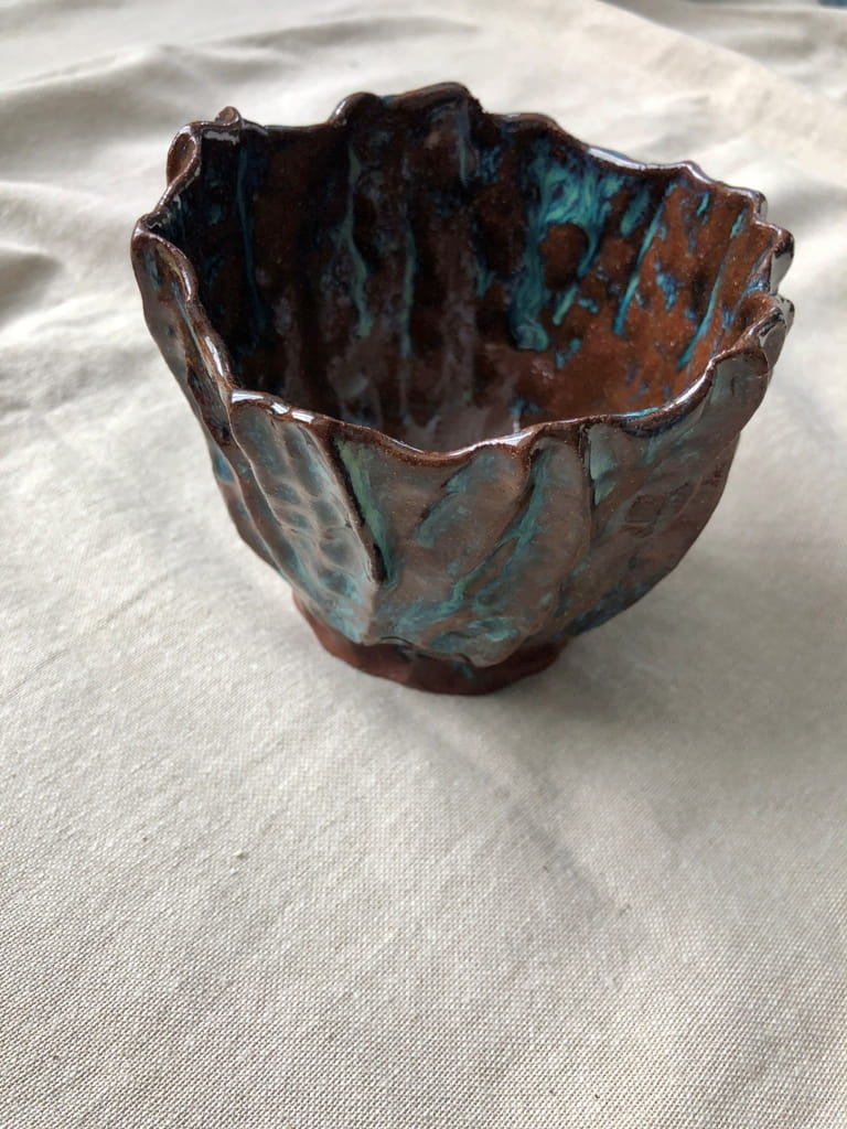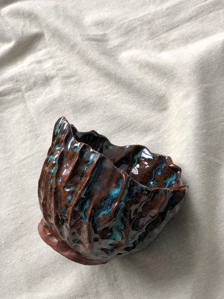 Osłonkę ulepiłam z terakotowej gliny i poszkliwiłam tak, aby na jej powierzchni uzyskać niejednolitą fakturę w odcianiach brązu i turkusu.