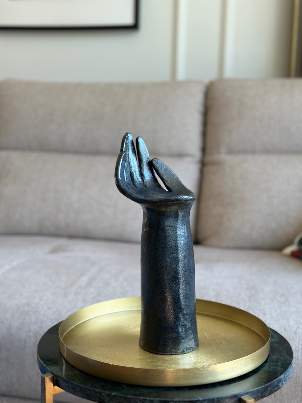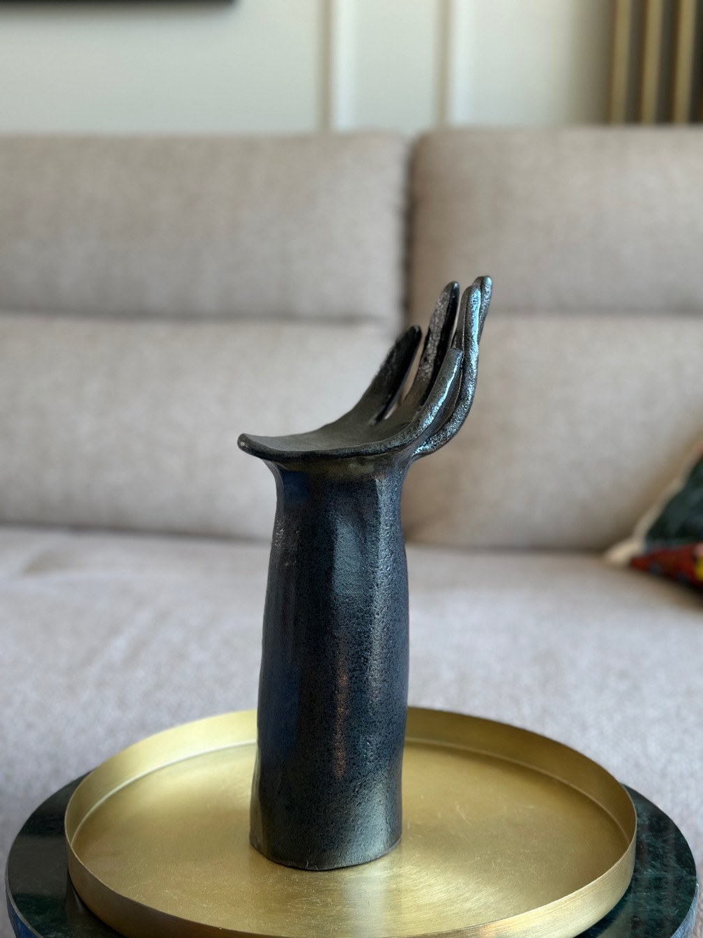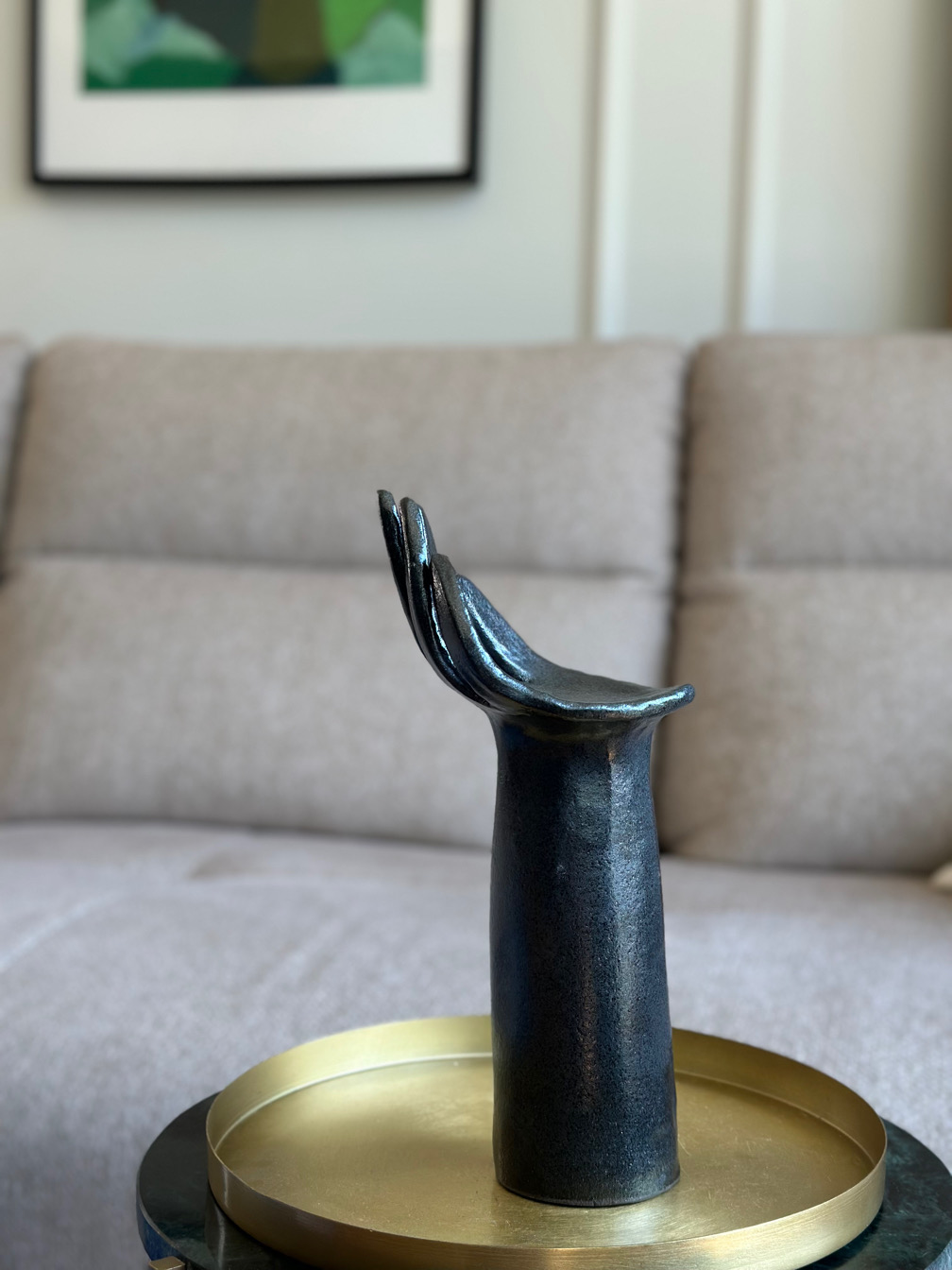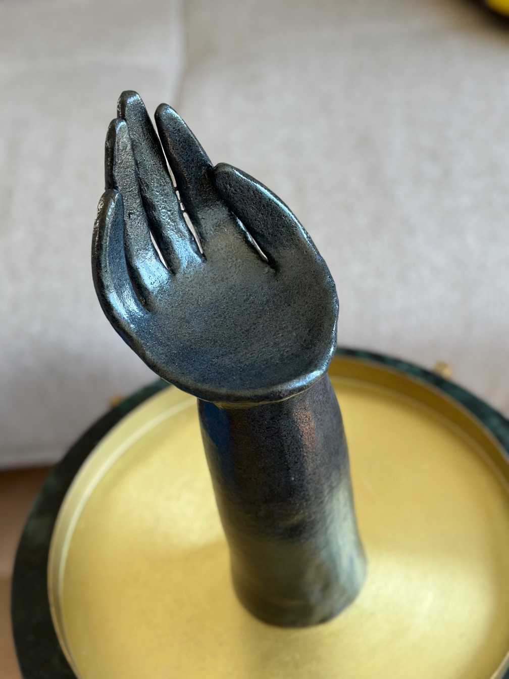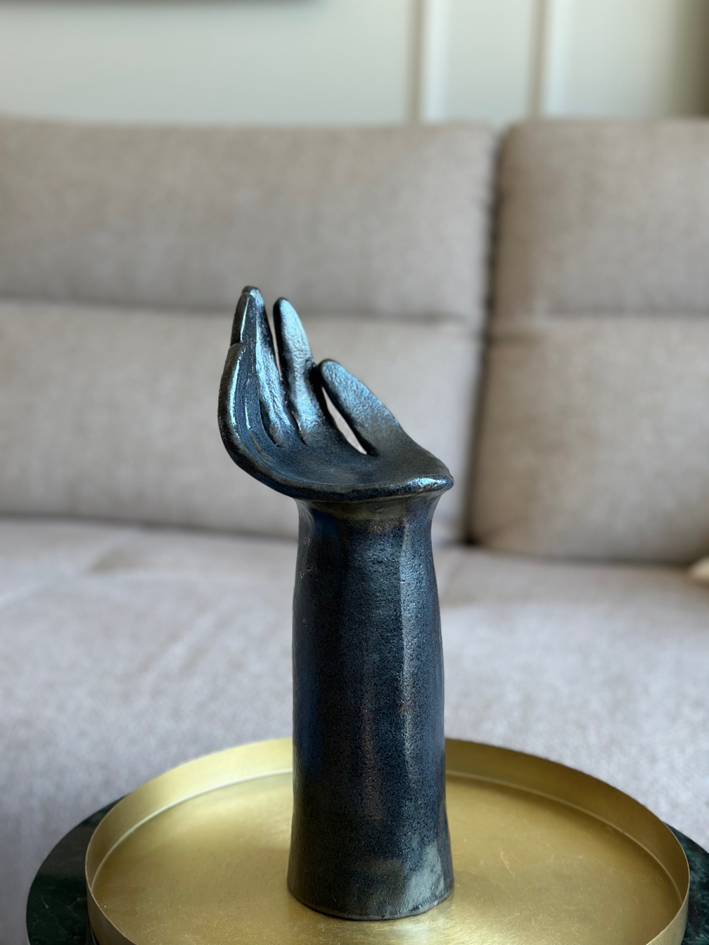 Ceramiczna rzeźba przedstawiająca rękę to niebanalny dodatek do Twojego wnętrza. Pięknie będzie prezentowała się wyeksponowana na regale, albo komodzie, w towarzystwie sztuki, kwiatów, ale również solo, w surowym i minimalistycznym wnętrzu.