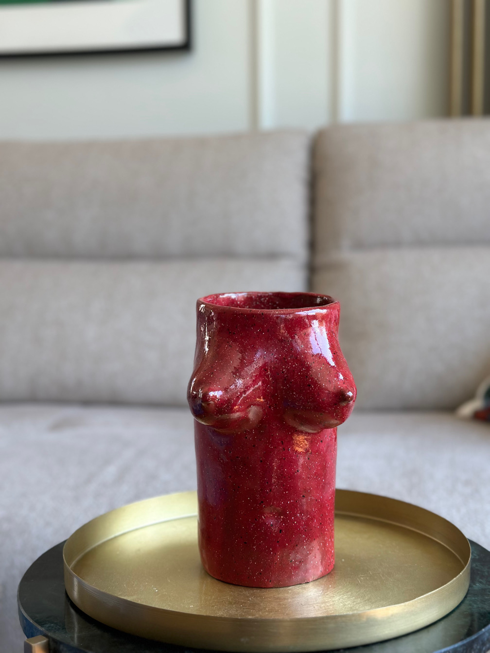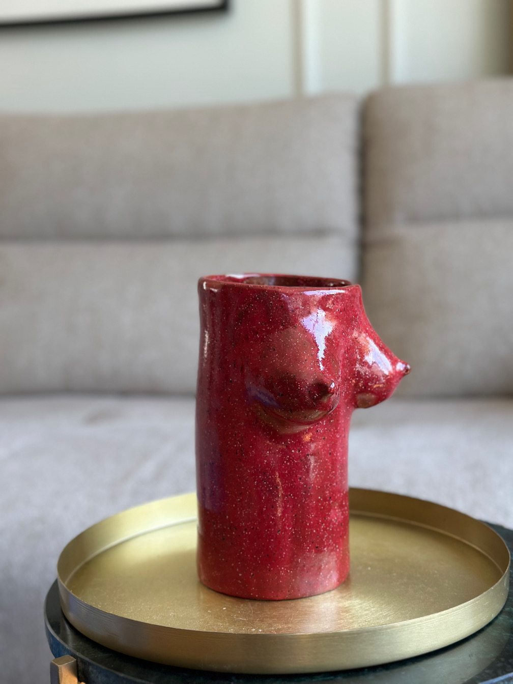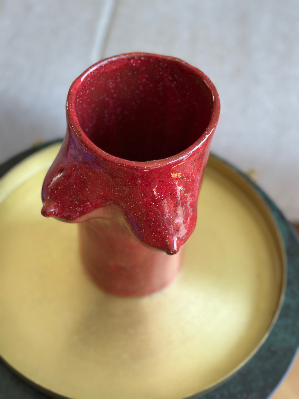 Wazon ulepiłam z terrakotowej gliny i pokryłam szkliwem w odcieniu zgaszonej czerwieni wpadającej w bordo, z delikatnymi białymi i czarnymi stopeczkami.