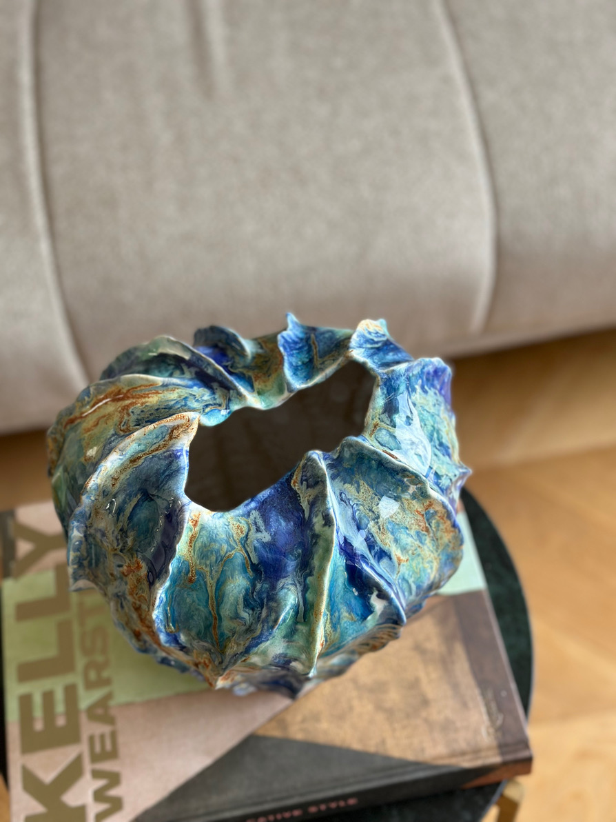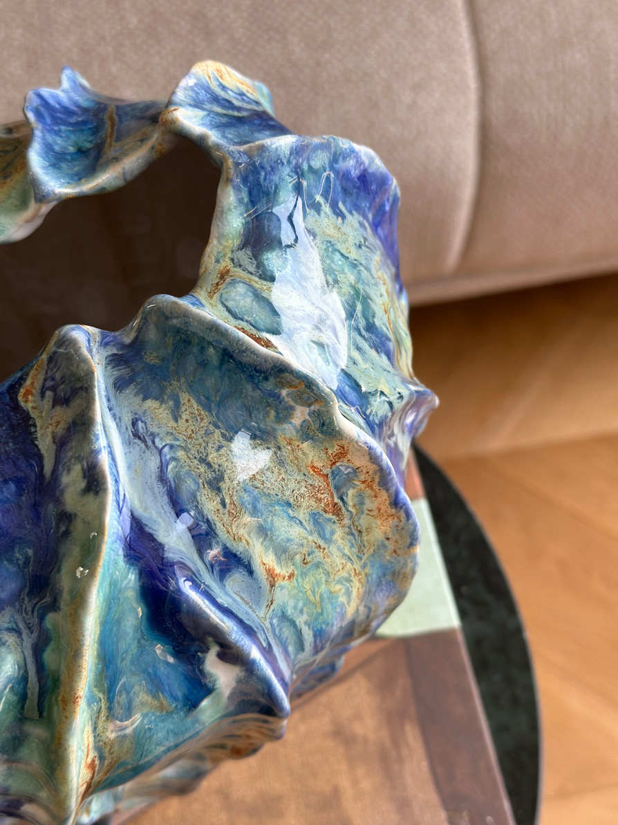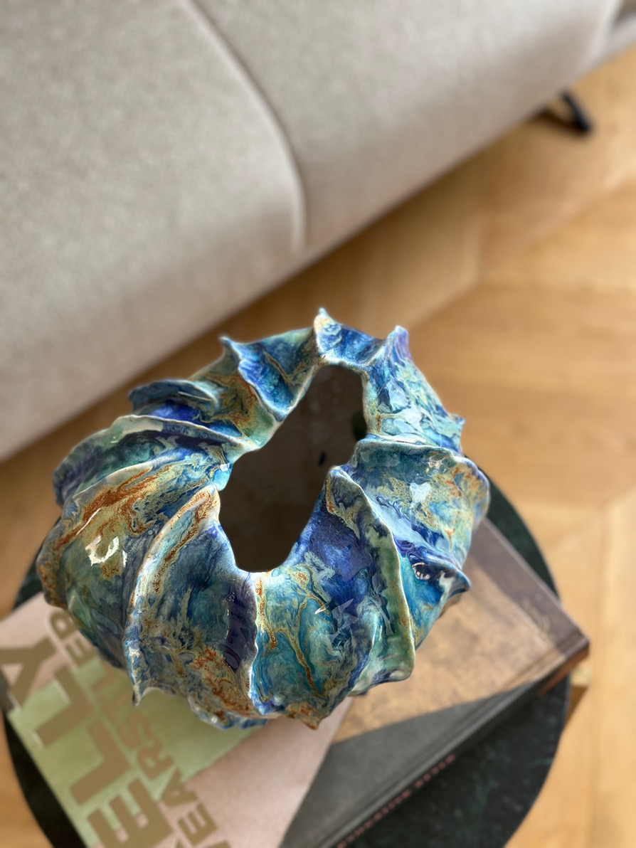 Naczynie ulepiłam ręcznie, a faktura, którą nadałam jej od zewnętrznej strony delikatnie nawiązuje do moich muszli. Jej organiczny kształt idealnie koreluje z oryginalnym szkliwieniem, jakby malarskich zacieków w odcieniach niebieskiego, turkusu, bieli przełamanych miodowymi akcentami.