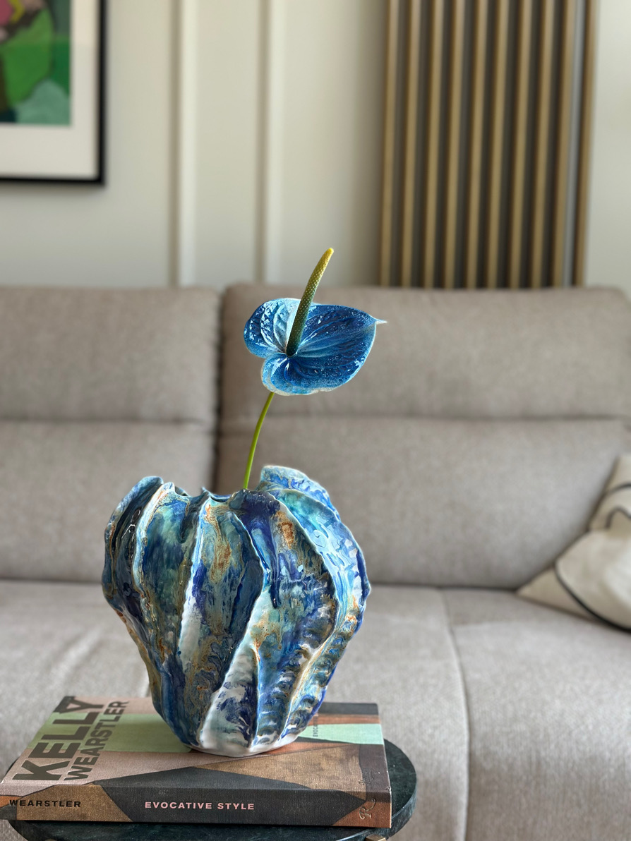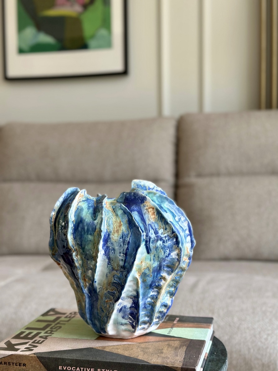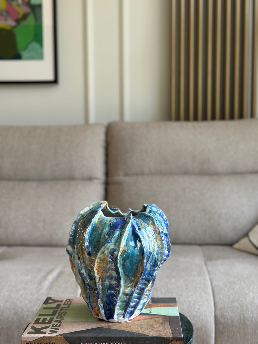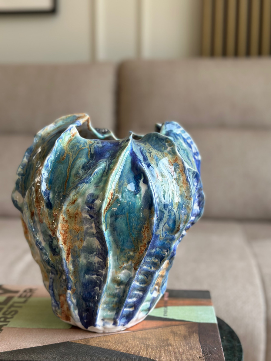 Naczynie ulepiłam ręcznie, a faktura, którą nadałam jej od zewnętrznej strony delikatnie nawiązuje do moich muszli. Jej organiczny kształt idealnie koreluje z oryginalnym szkliwieniem, jakby malarskich zacieków w odcieniach niebieskiego, turkusu, bieli przełamanych miodowymi akcentami.