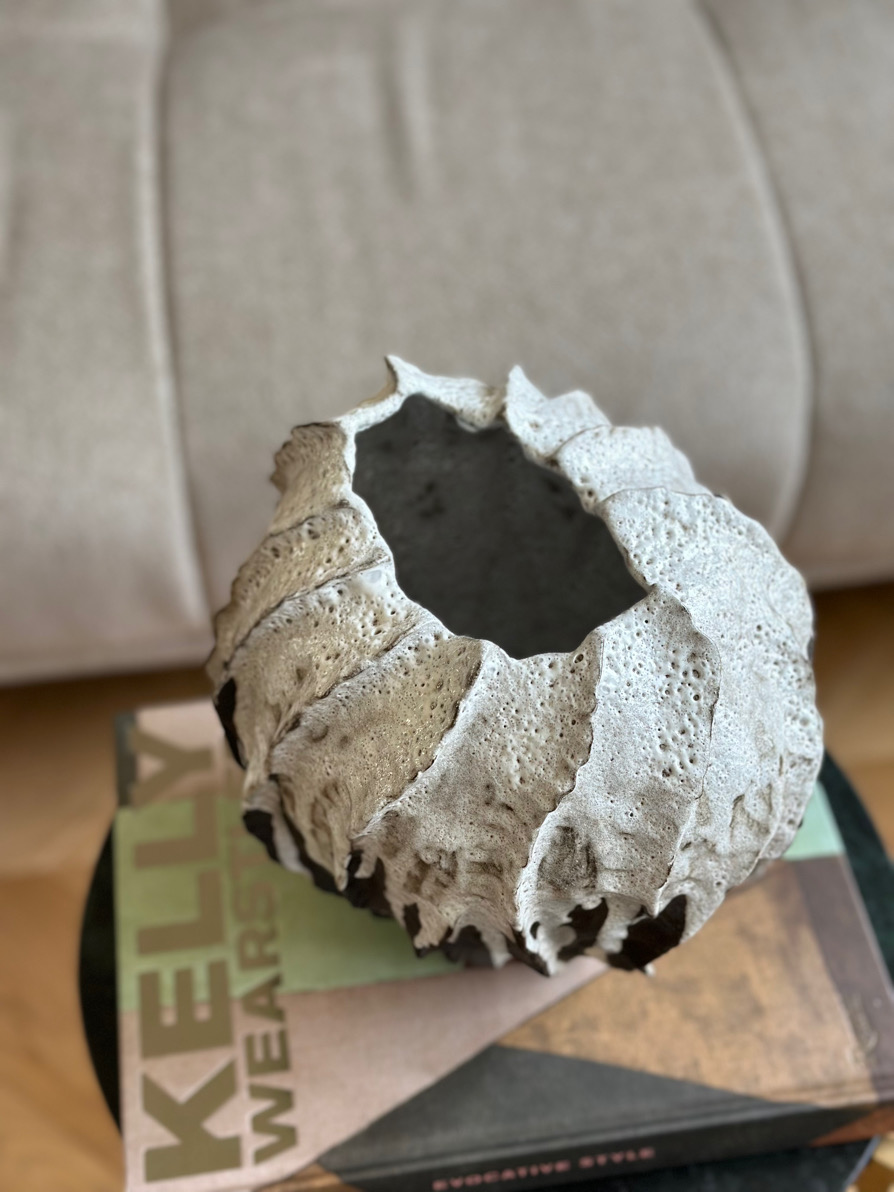 Naczynie ulepiłam ręcznie, a faktura, którą nadałam jej od zewnętrznej strony delikatnie nawiązuje do moich muszli. Jej organiczny kształt idealnie koreluje z oryginalnym szkliwieniem- naczynie ulepione zostało z ciemno-czekoladowej gliny, którą zdobi białe szkliwo ściekające aż do dna.